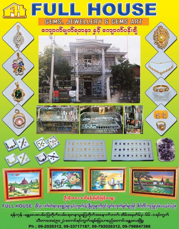 Full House is located in အမွတ္(၆၃-၃၃)၊ ၁ရပ္ကြက္၊ သီတာေအး (၉၀၂)၊ ေတာင္ရပ္ကြက္၊ ရန္ကုန္ မႏၱေလးလမ္း၊ ျပတိုက္လမ္း၊ ရတနာပူရ အေနာက္ဘက္, Chan Mya Thar Si township, Mandalay, Myanmar. Company's main business category is Jewellery Shops.